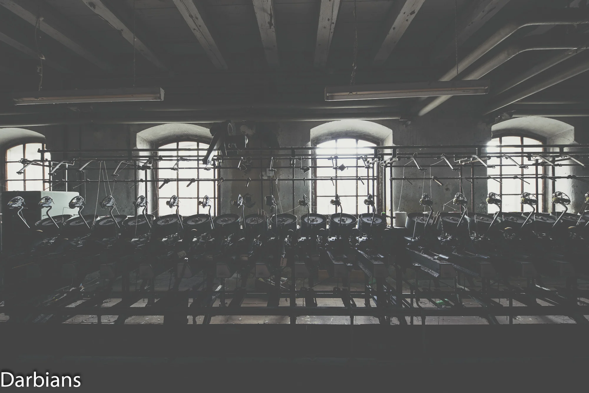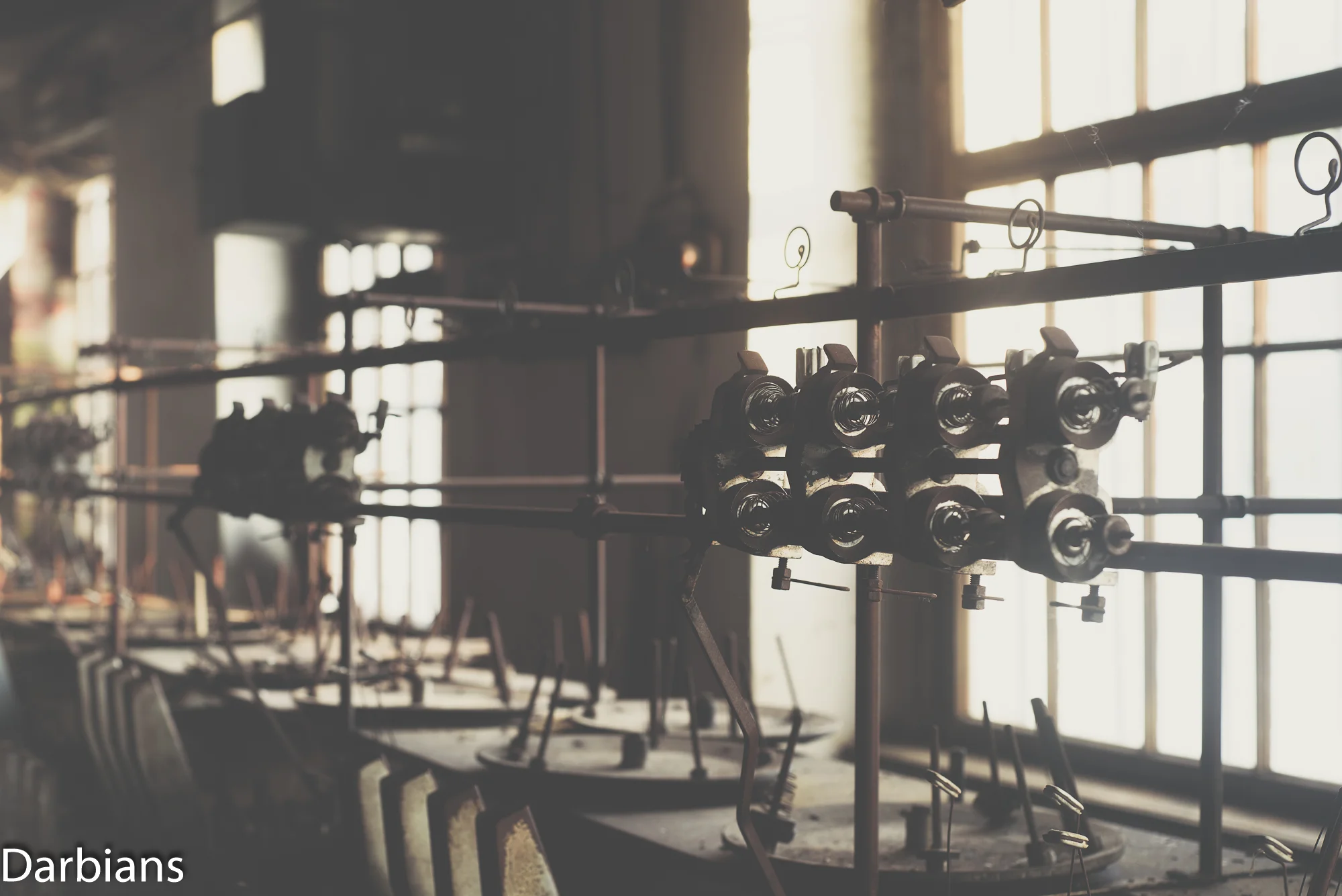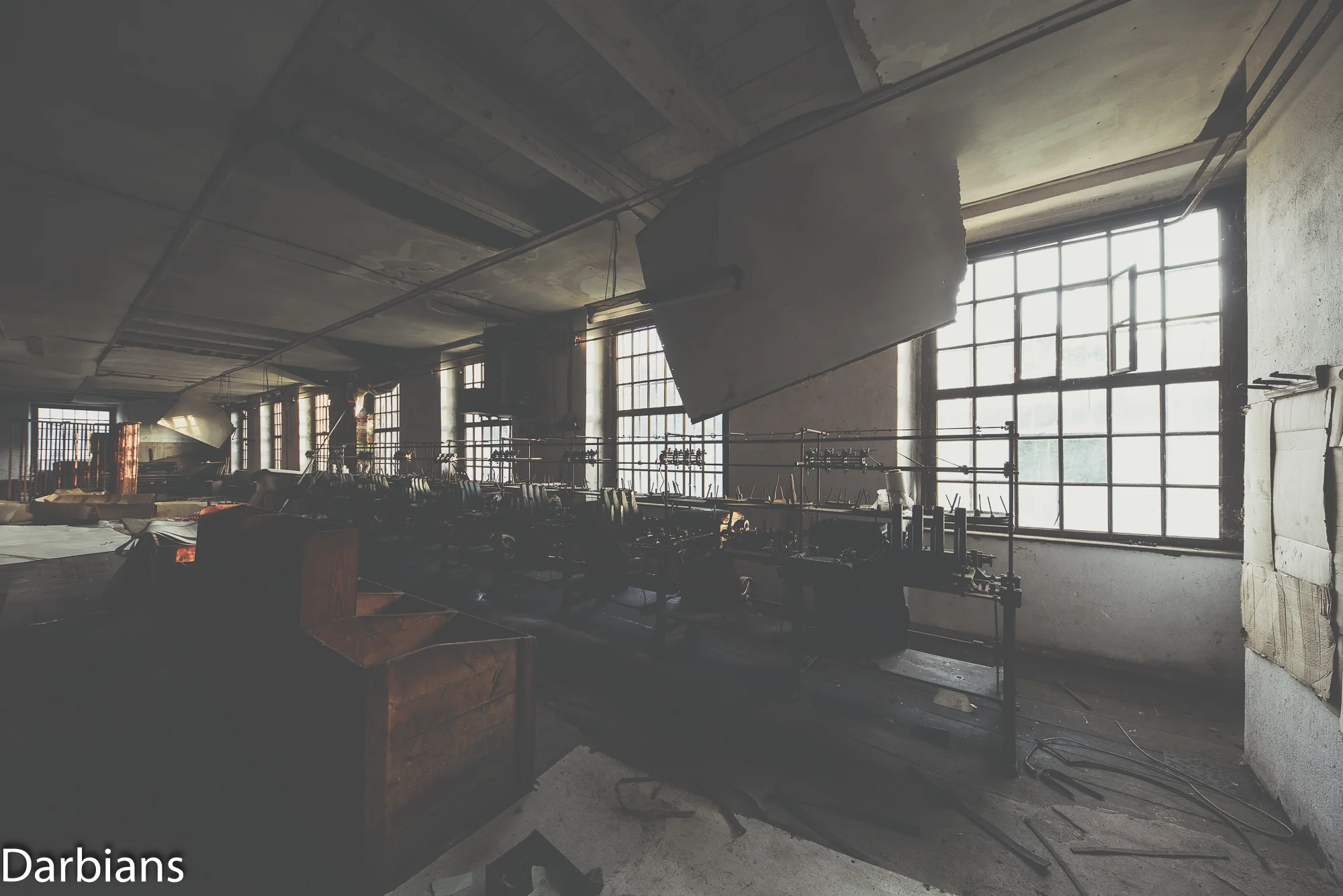 Shop floor. The green, amber and red lights look out of place with the old machinery.