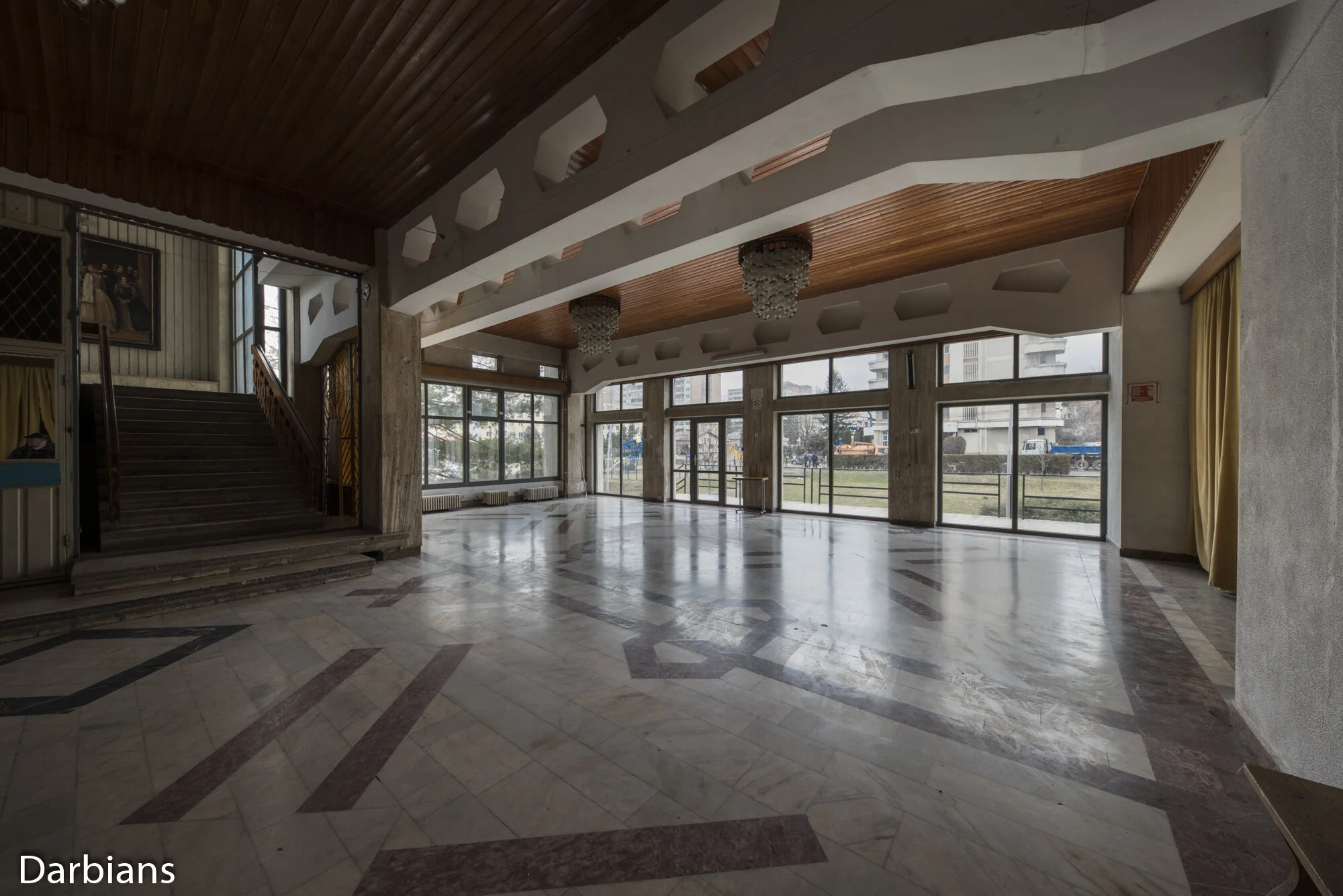 Campina Youth House: Main staircase and full view of the chandelier.