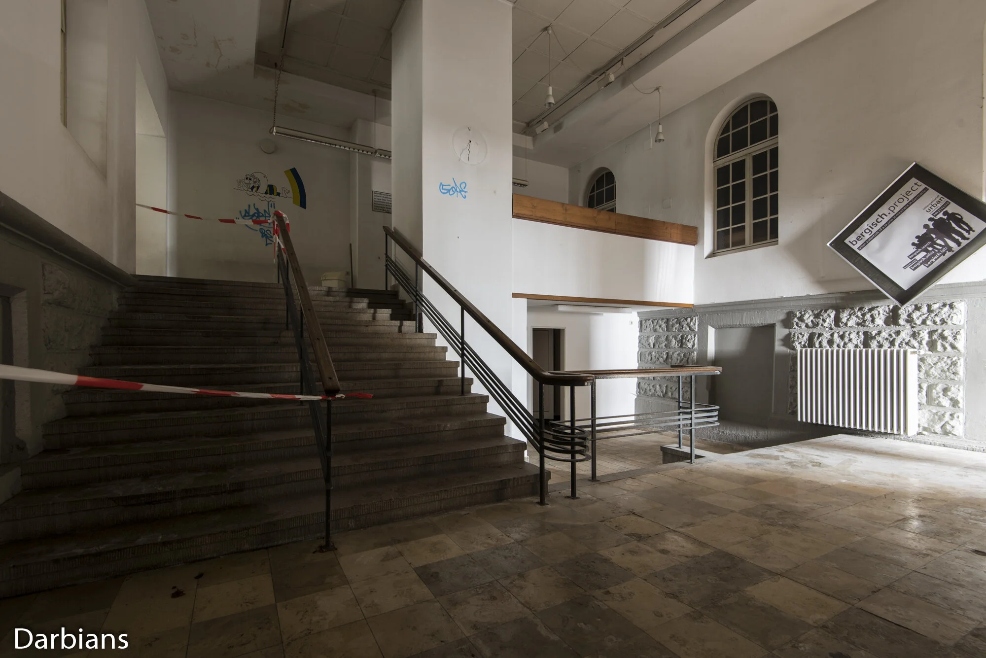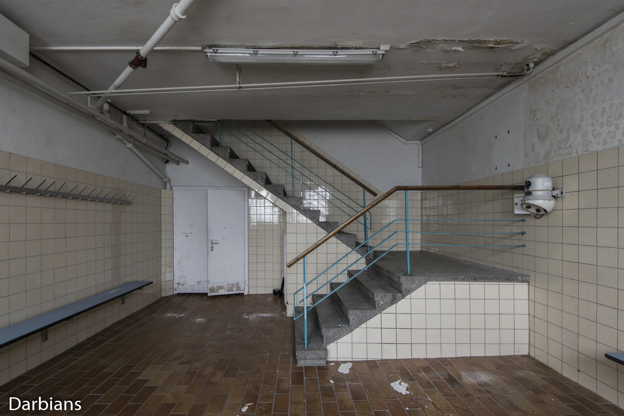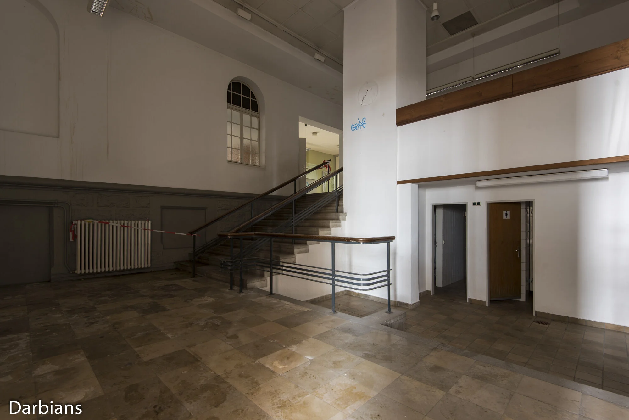 Das Hallenbad: Stairs up to the viewing area and down to the basement.