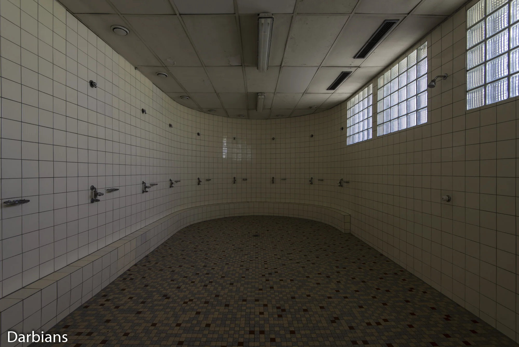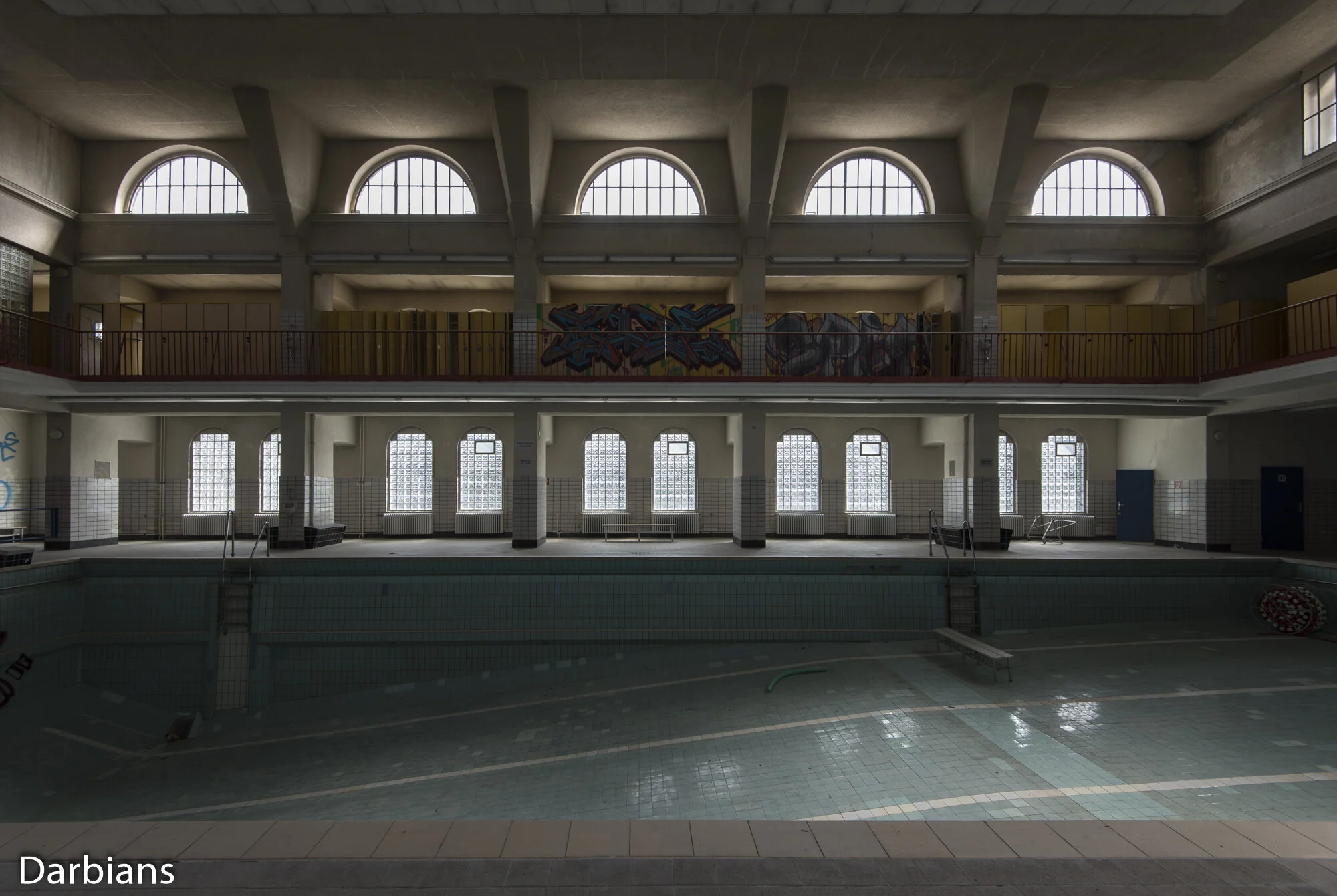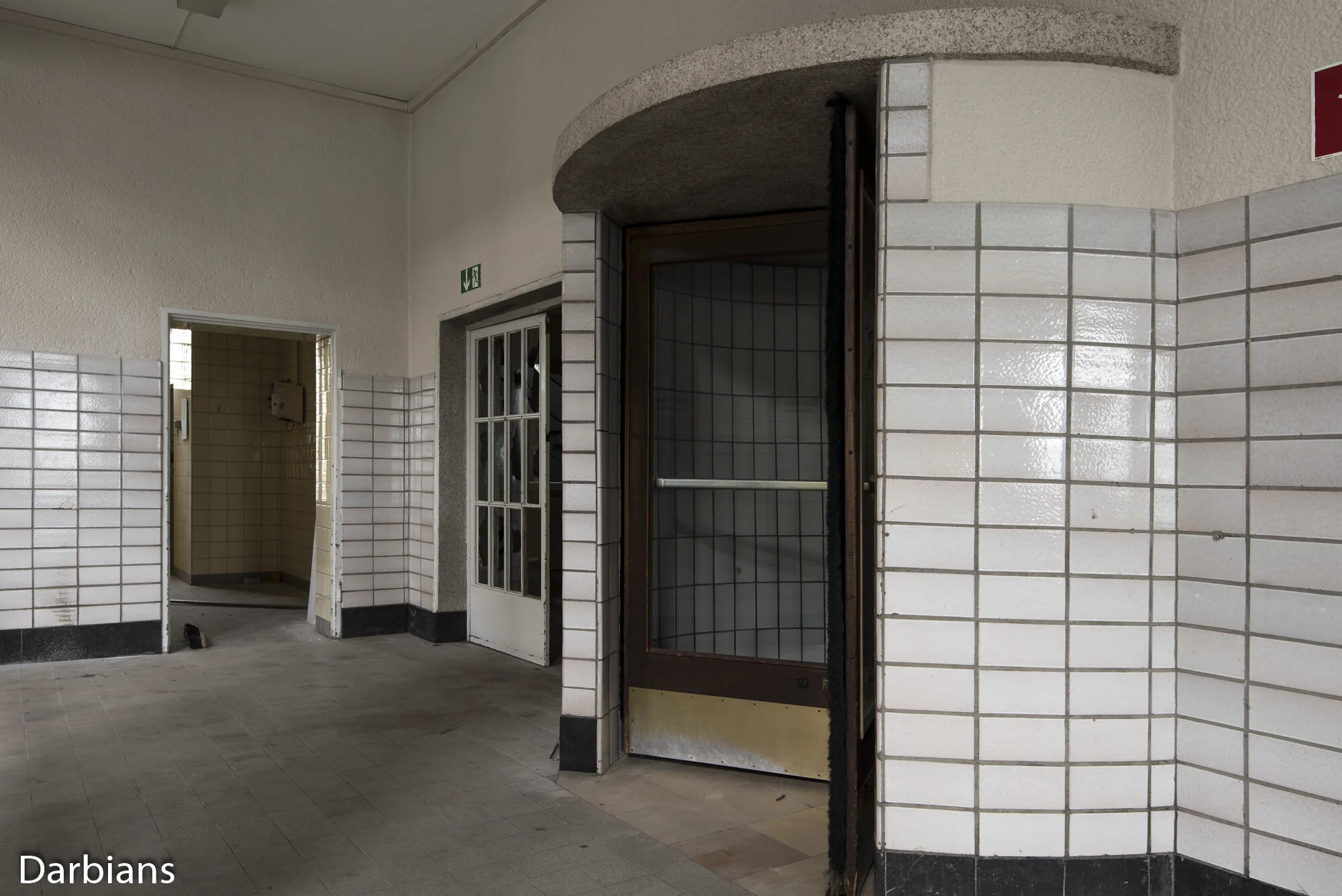 Das Hallenbad: Stairs up to the viewing area and down to the basement.