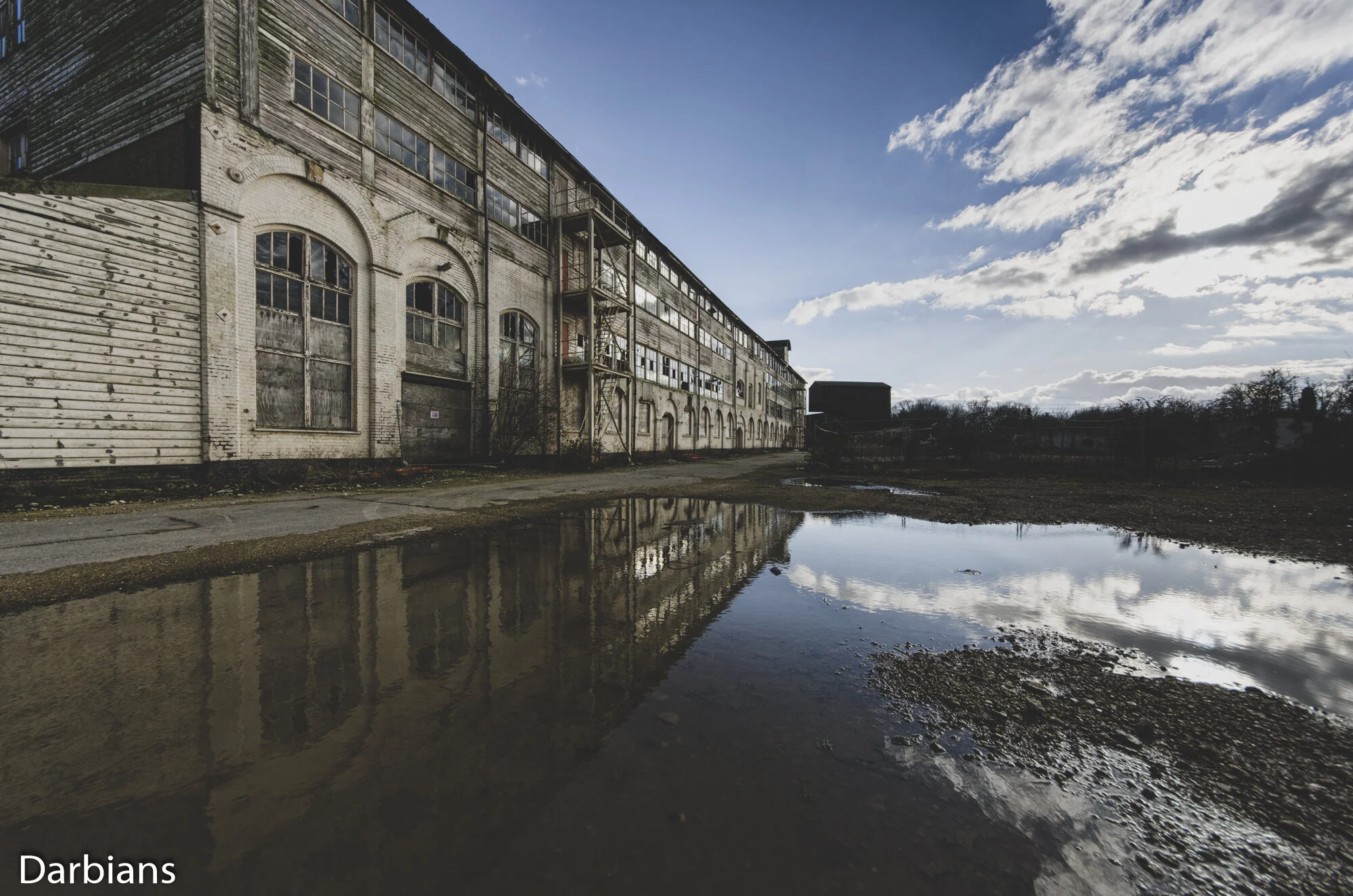 Fisons Fertiliser Factory Ipswich: External of the main building making use of the large puddle.