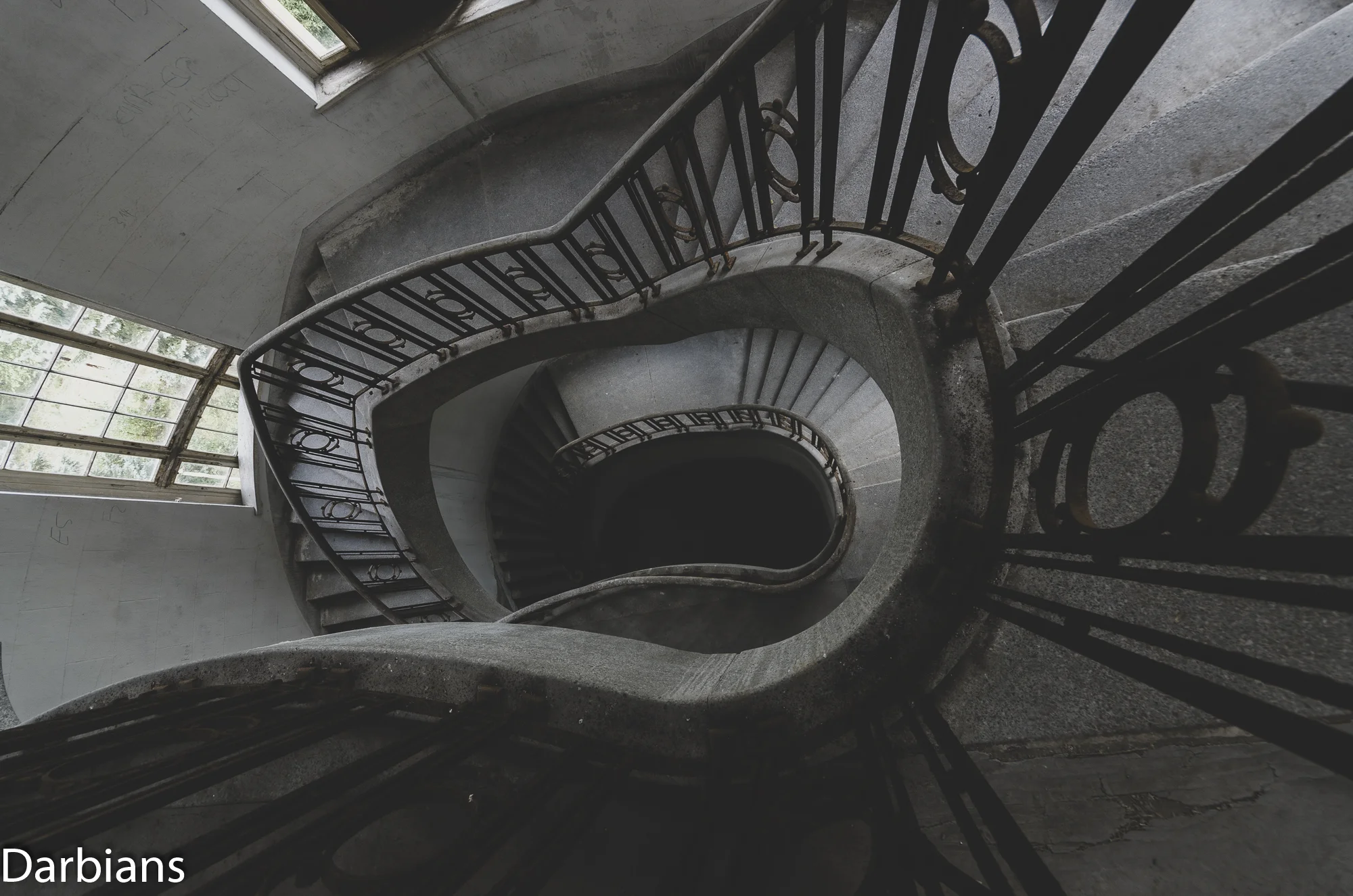 Haus Der Offiziere Wünsdorf Main Building. Looking down the curved staircase.