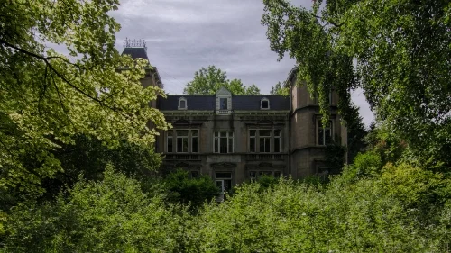 A small abandoned chateau in Belgium with a beautiful staircase.