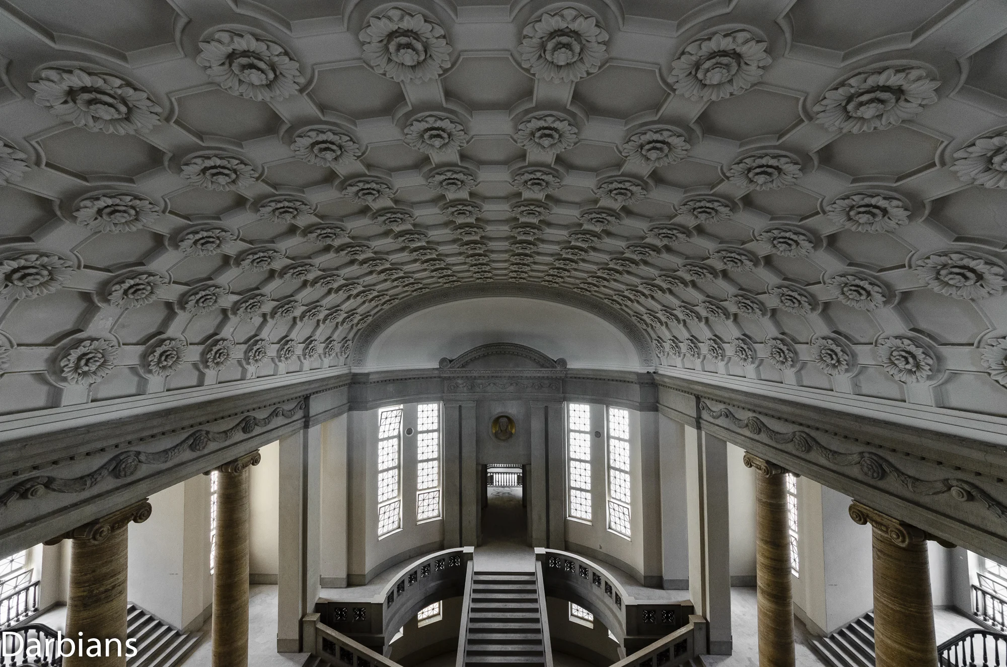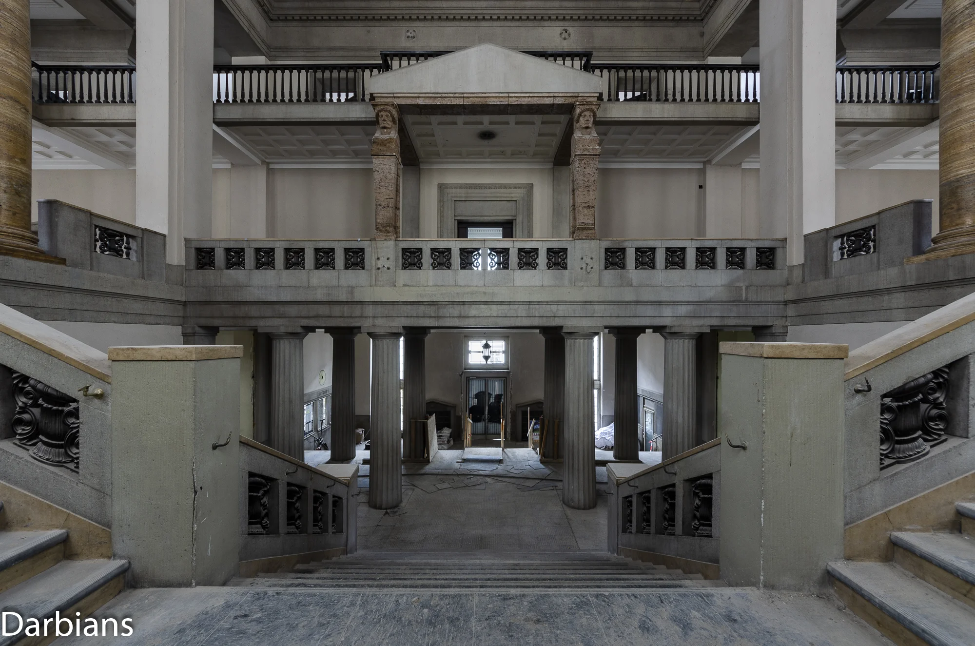 Looking back at the entrance from the middle of the main staircase. Notice the Egyptian Revival statuesque columns.