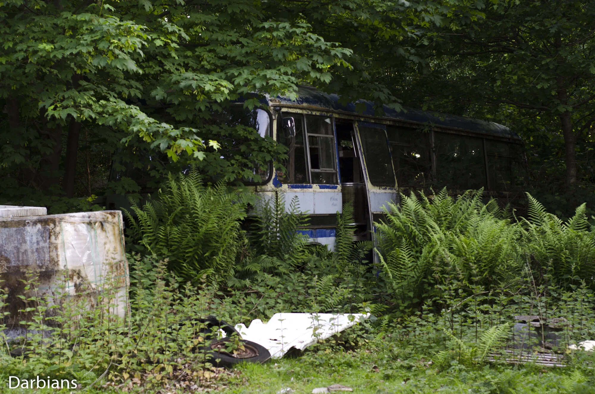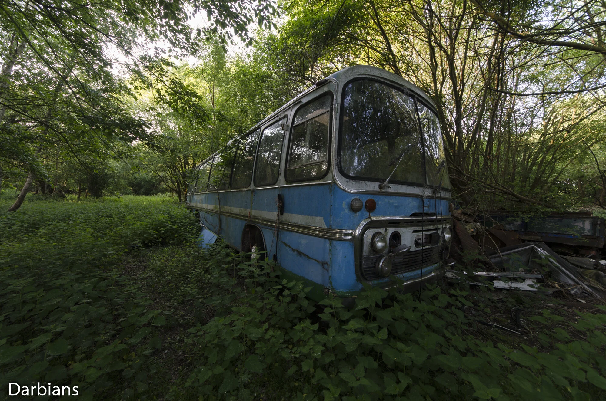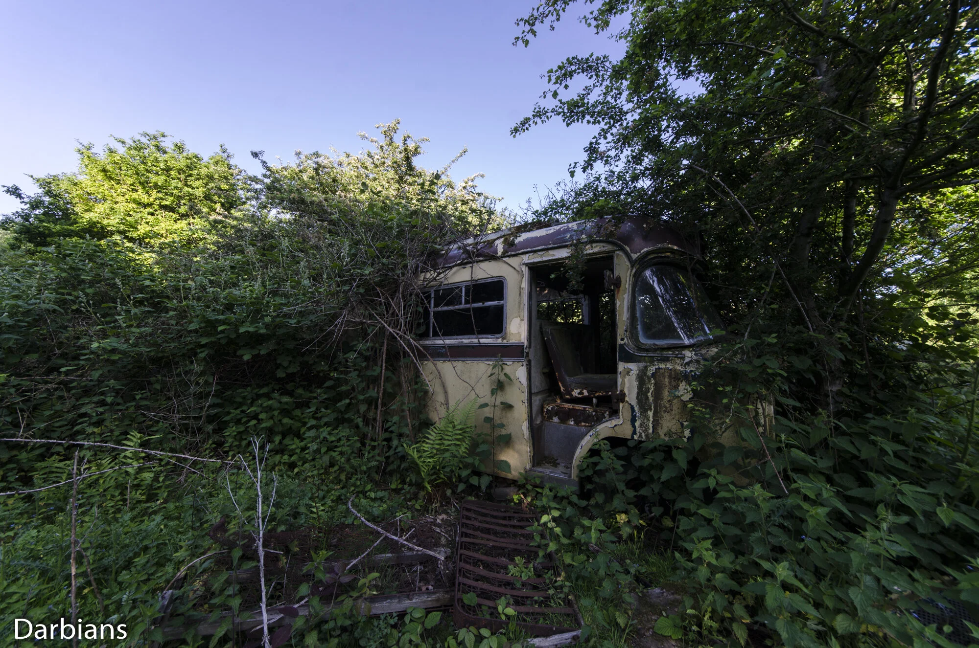 Meddlers Scrapyard: A coach in the middle of the woods.