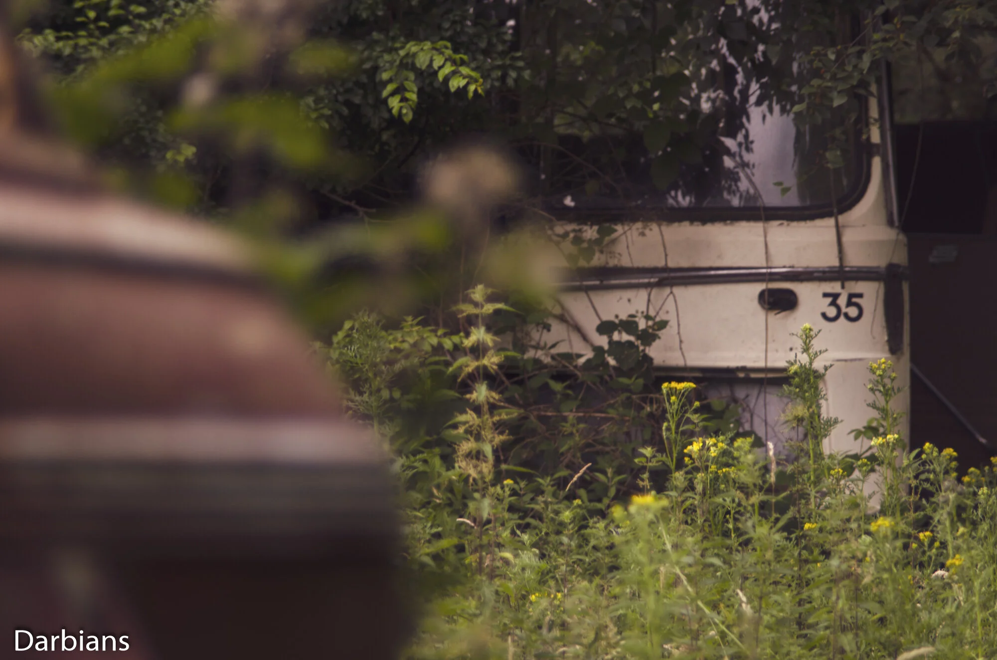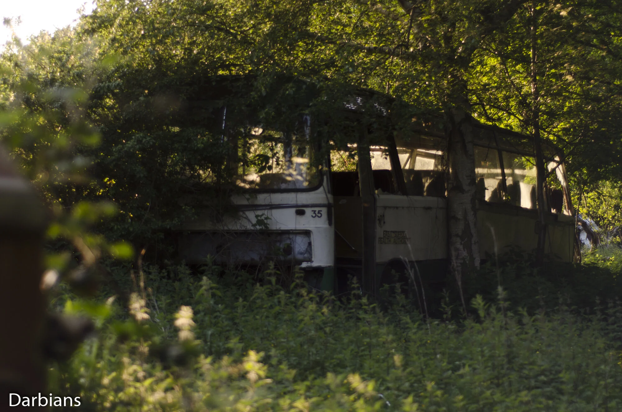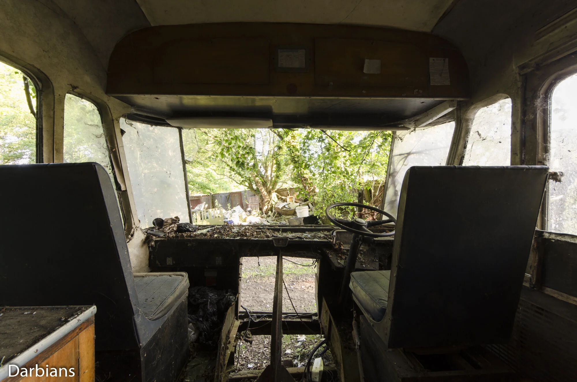 Meddlers Scrapyard: A coach in the middle of the woods.