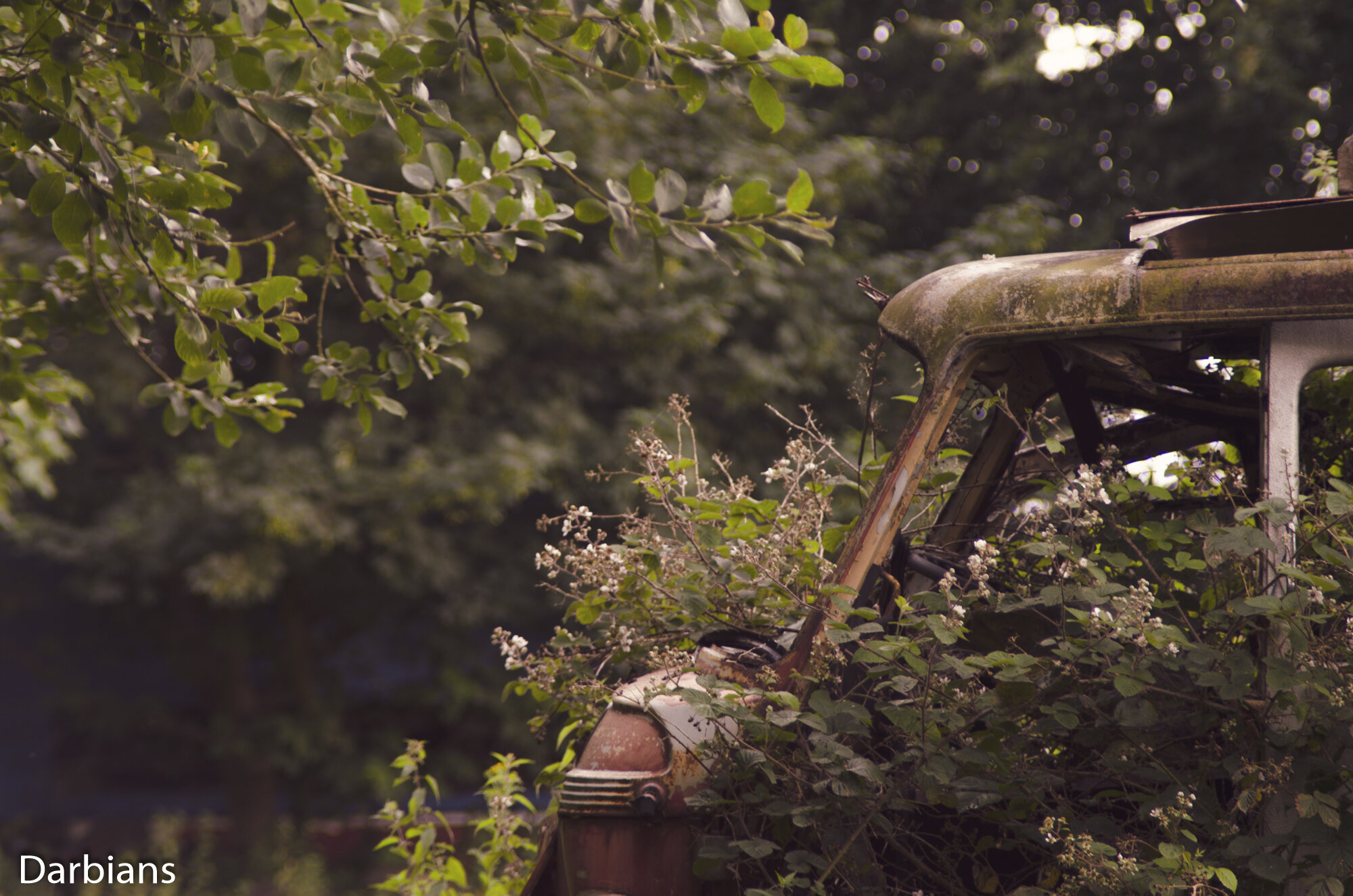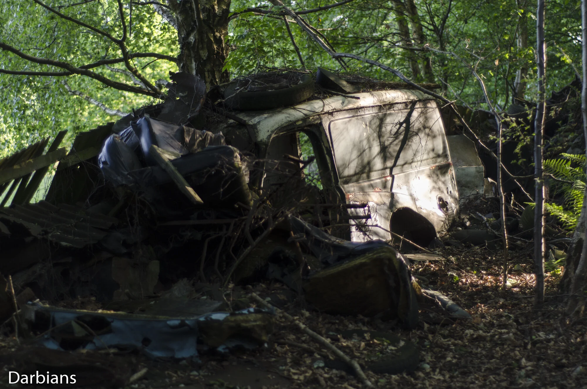Meddlers Scrapyard: An old van bursting out the overgrowth.