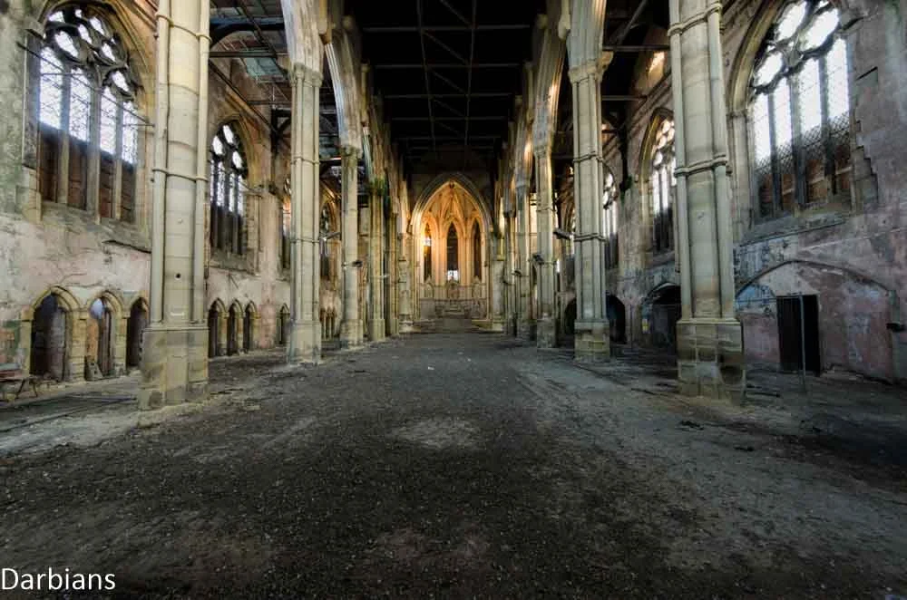 The abandoned Mount St Mary's Church or The Church Of The Immaculate Virgin Mary was designed in a Gothic Revival Style by the architect Joseph Hansom and construction started in 1853. However the building work was never completed and only the nave and side isles were built. The architect Edward Pugin completed the design working on the chancel and transepts. Finally with construction complete at a total cost of £8000 the church opened in 1866.