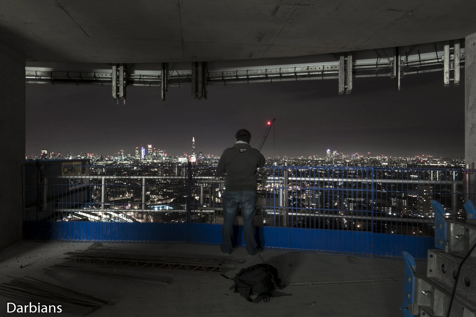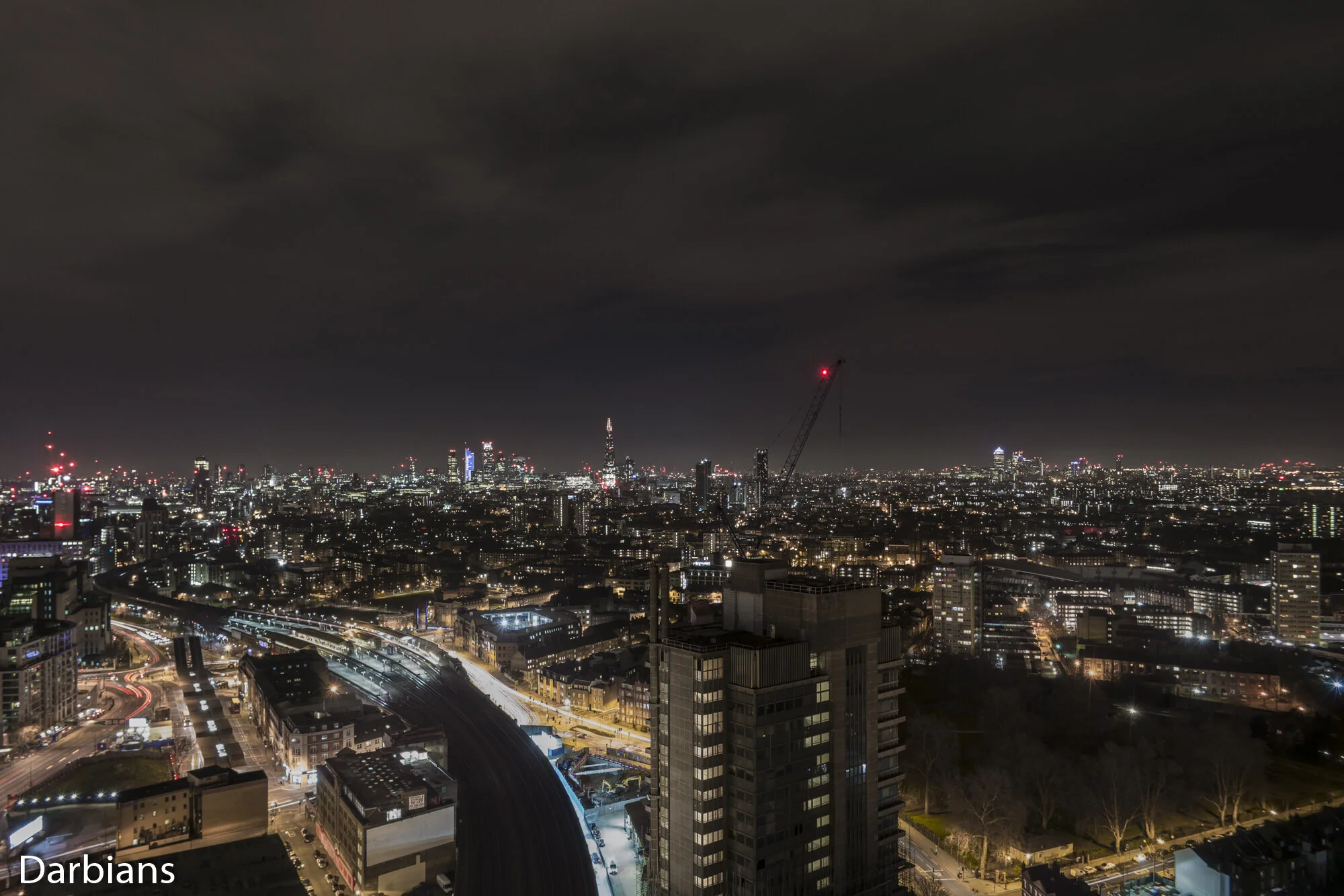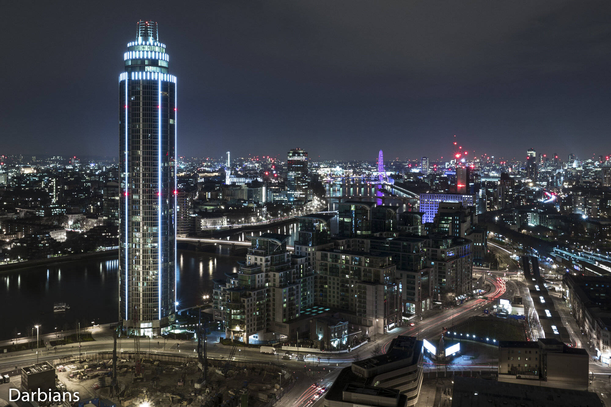 London Skyline: The Thames leading down to the purple glow of the London Eye.