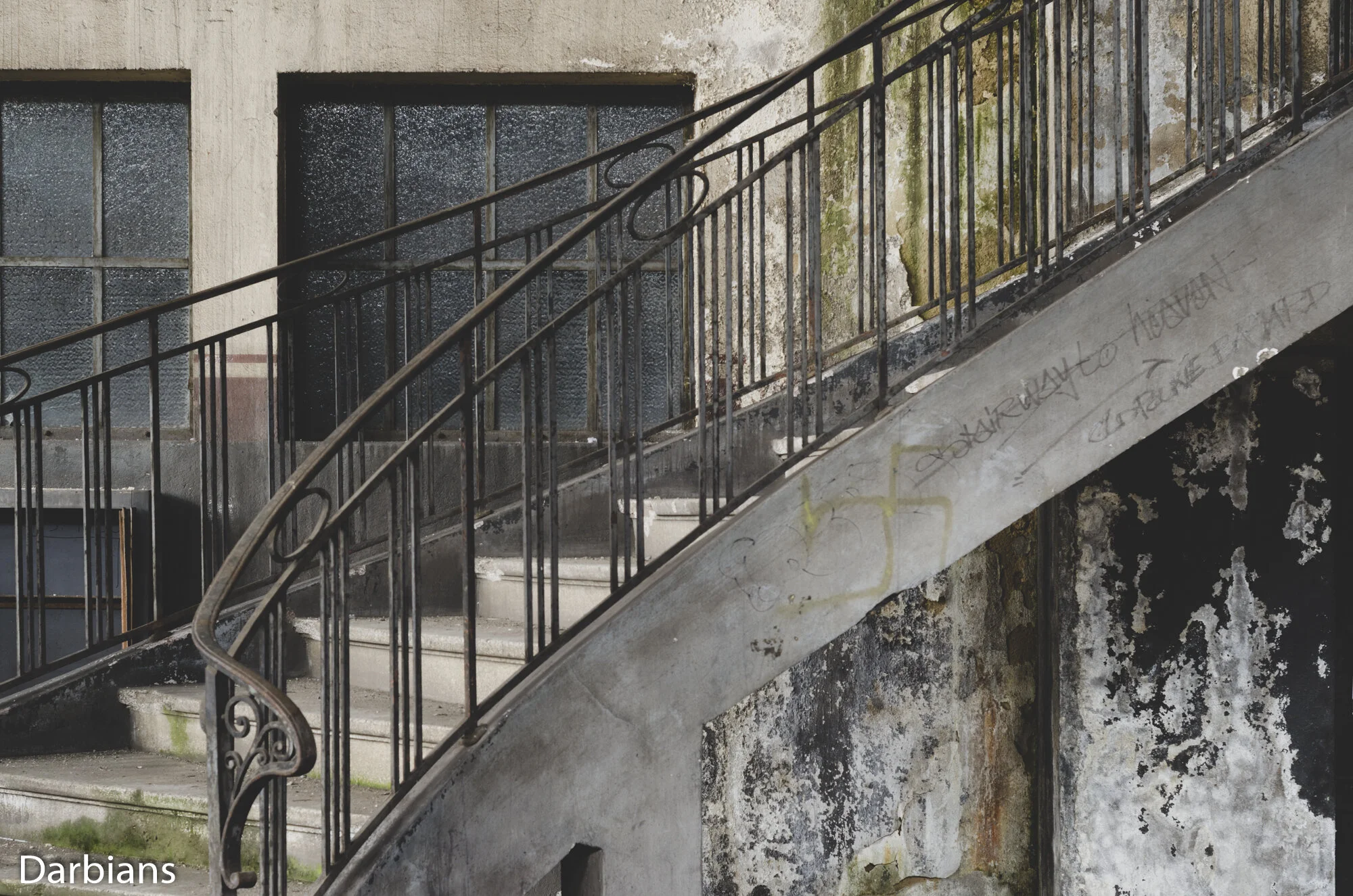 The Alienworks: Small control room below with the curved staircases leading up to the older control panels.