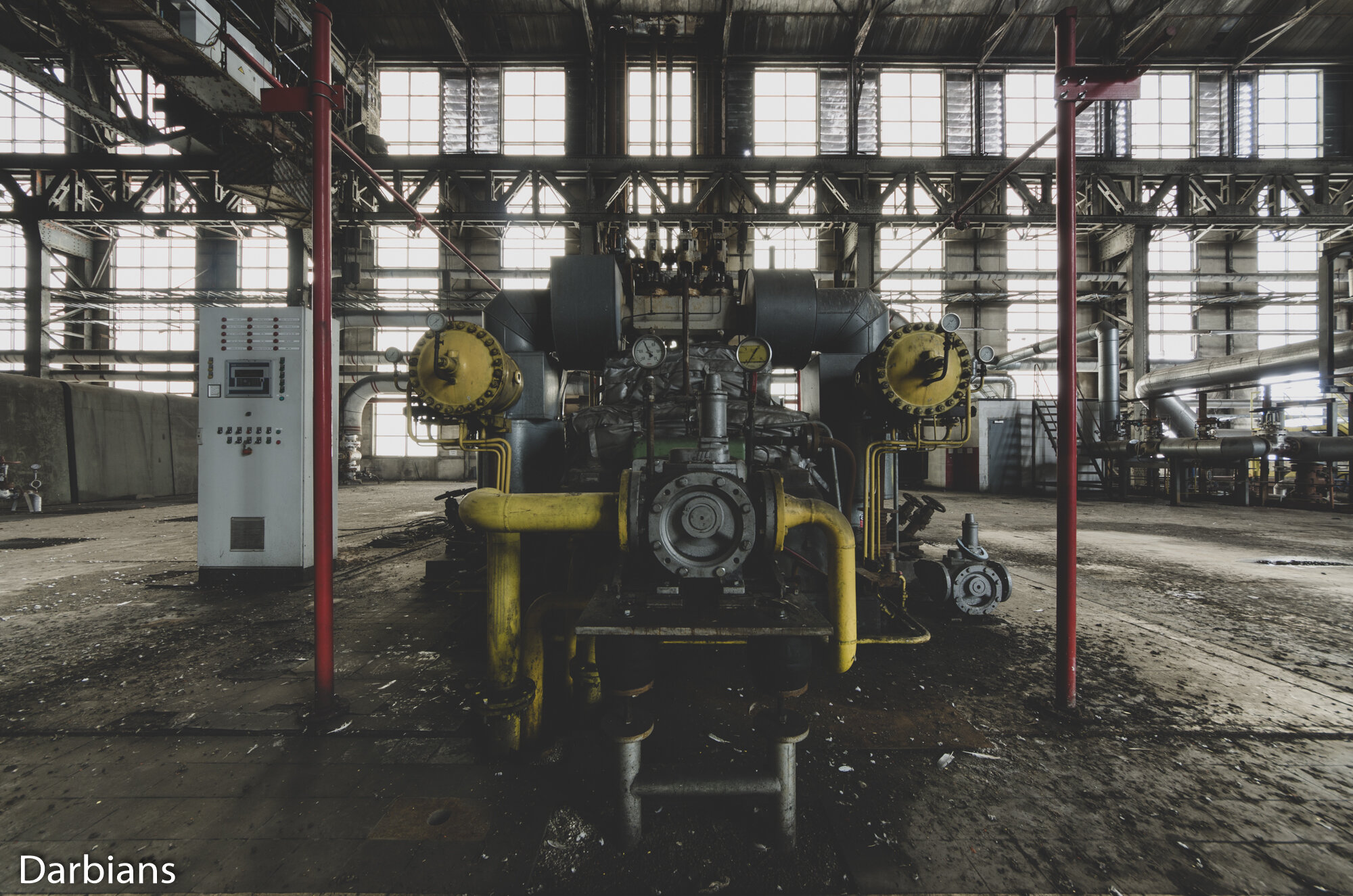 Blue Power Station Carsid: There was a huge puddle so made use of it while shooting this old Ingersoll Rand turbine.
