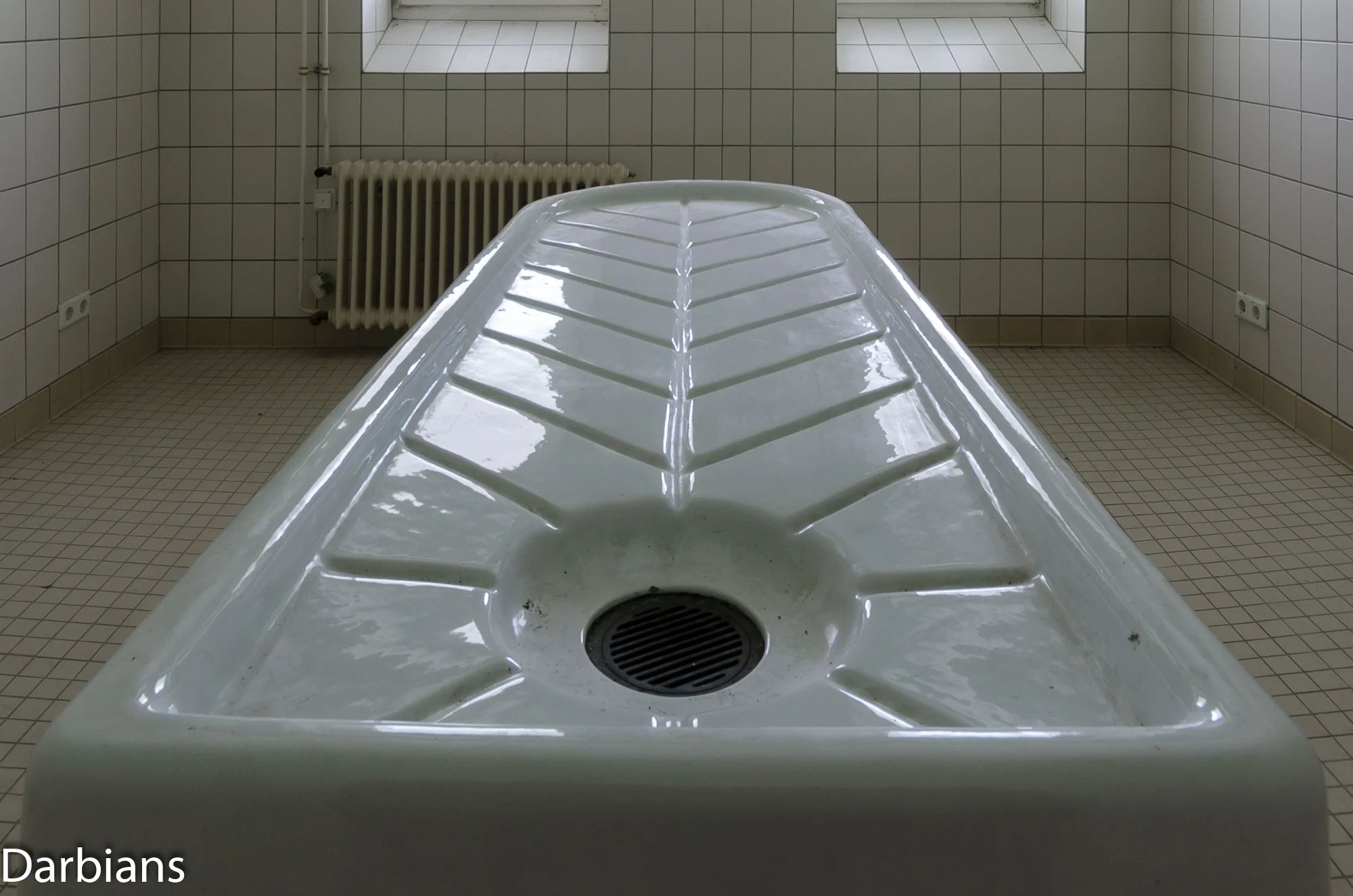 A sparse white tiled room with a porcelain slab it is hard to believe this clean morgue is actually in an abandoned hospital.